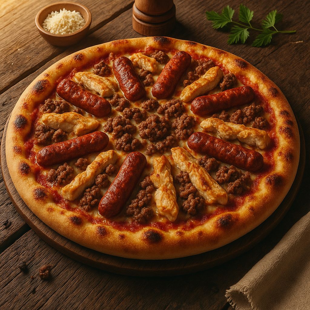 Sauce barbecue, mozzarella, bacon, boulettes de bœuf assaisonnées, oignons, maïs, piment