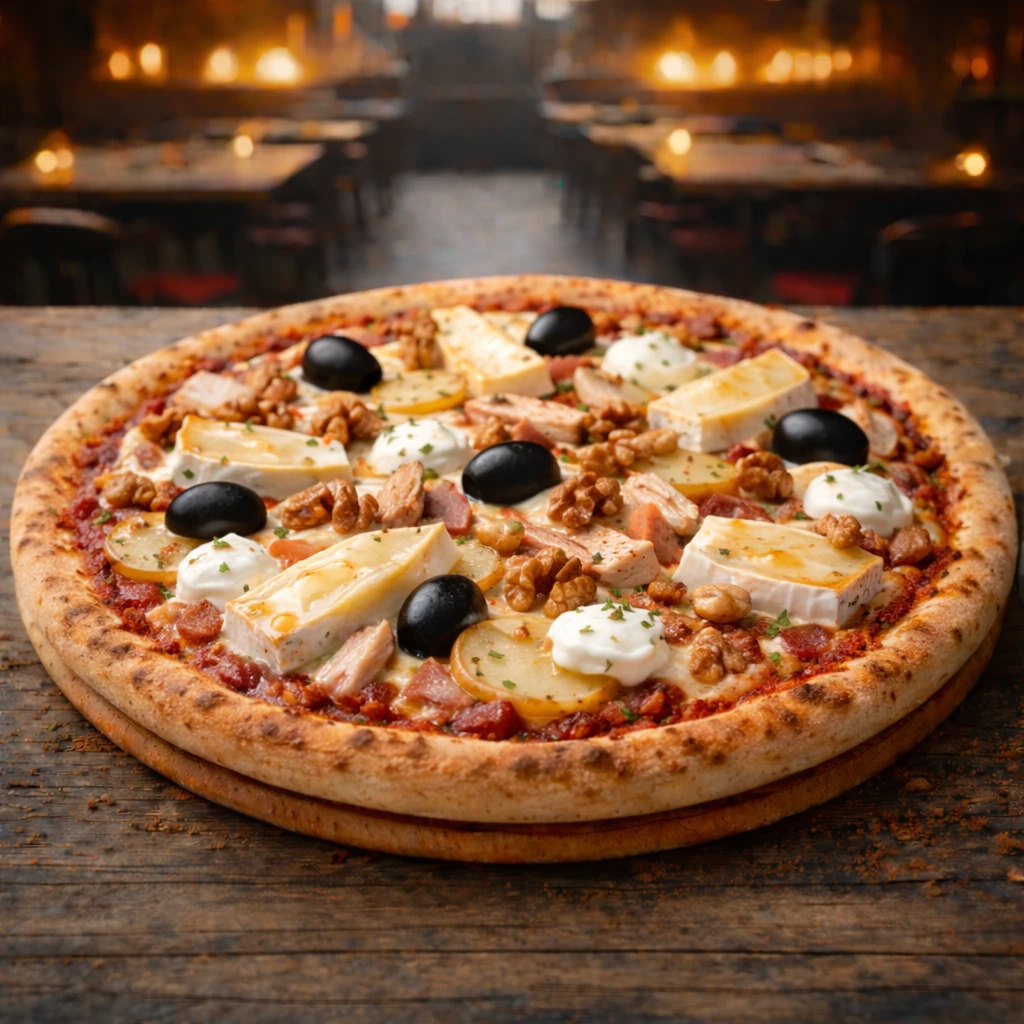Sauce tomate, mozzarella, poulet, pommes de terre, fromage de Brie, noix, crème fraîche, olives