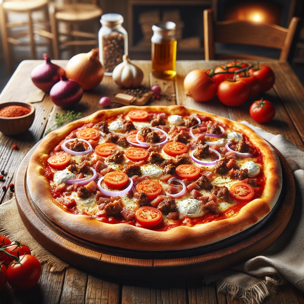 Sauce barbecue, mozzarella, poulet rôti, viande hachée épicée, merguez, olives