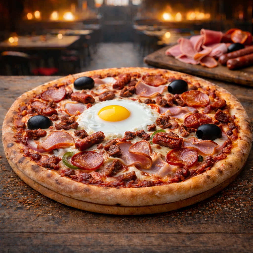 Sauce tomate, mozzarella, jambon, pepperoni, merguez, œuf