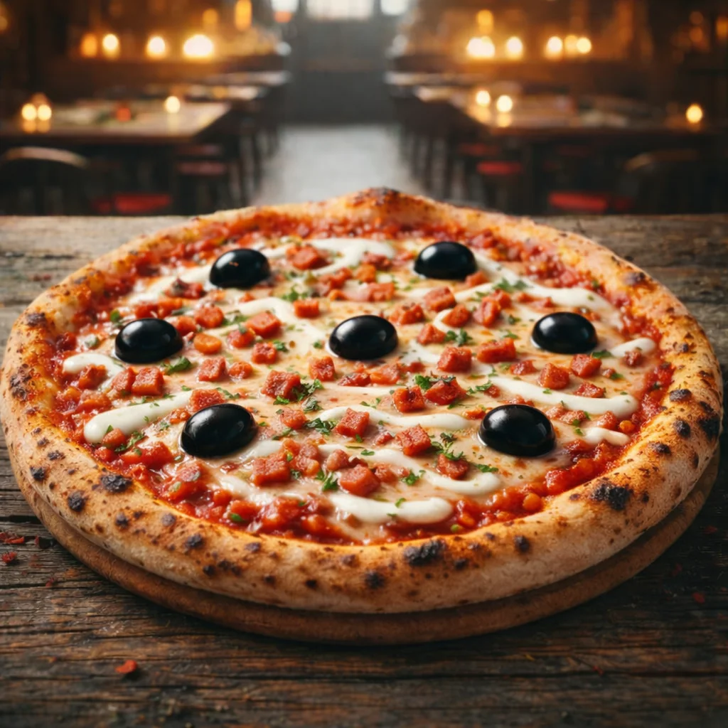 Sauce tomate, mozzarella, lardons, persillade, crème fraîche, olives