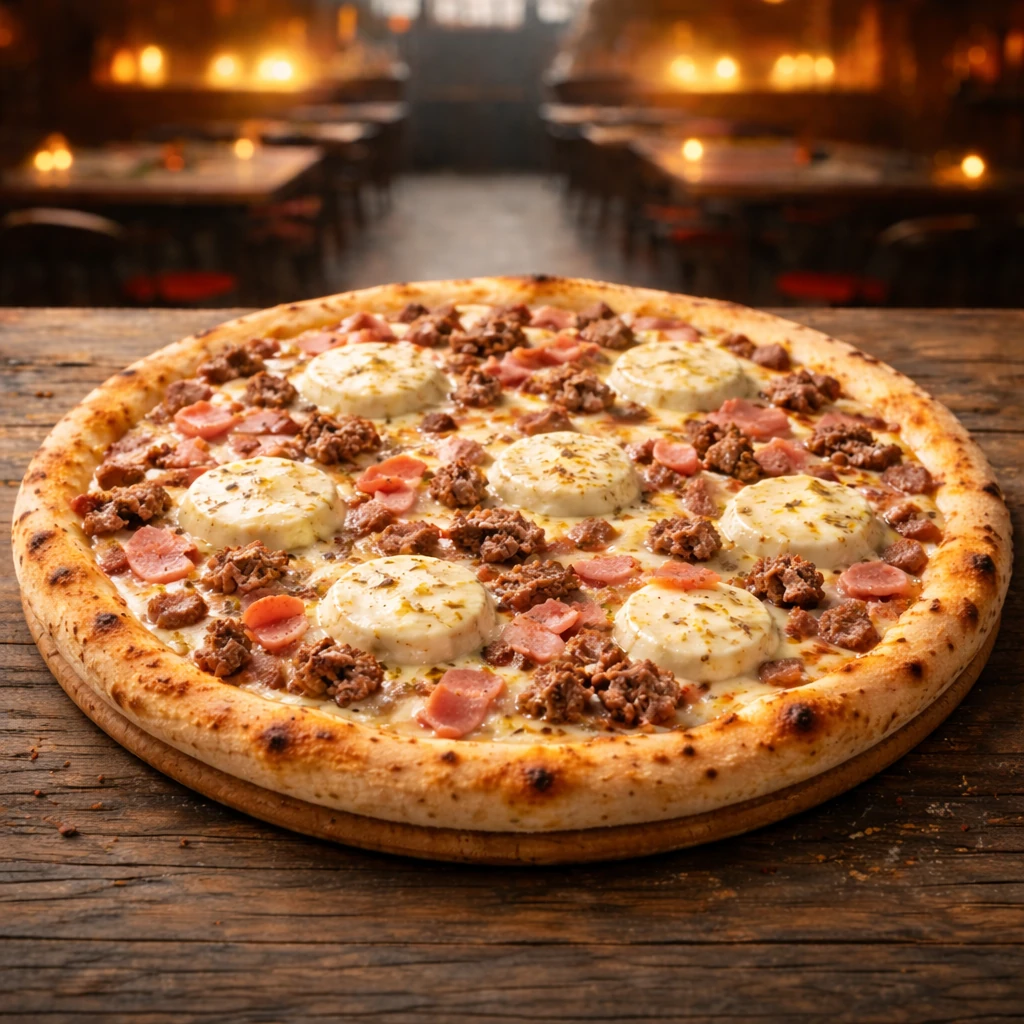 Crème fraîche, mozzarella, jambon, viande hachée, fromage de chèvre, origan