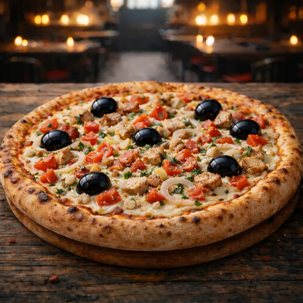 Sauce barbecue, mozzarella, poulet rôti, viande hachée épicée, merguez, olives