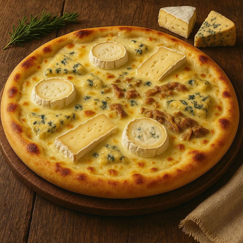 Crème fraîche, mozzarella, jambon, fromage à raclette, pommes de terre, oignons, olives