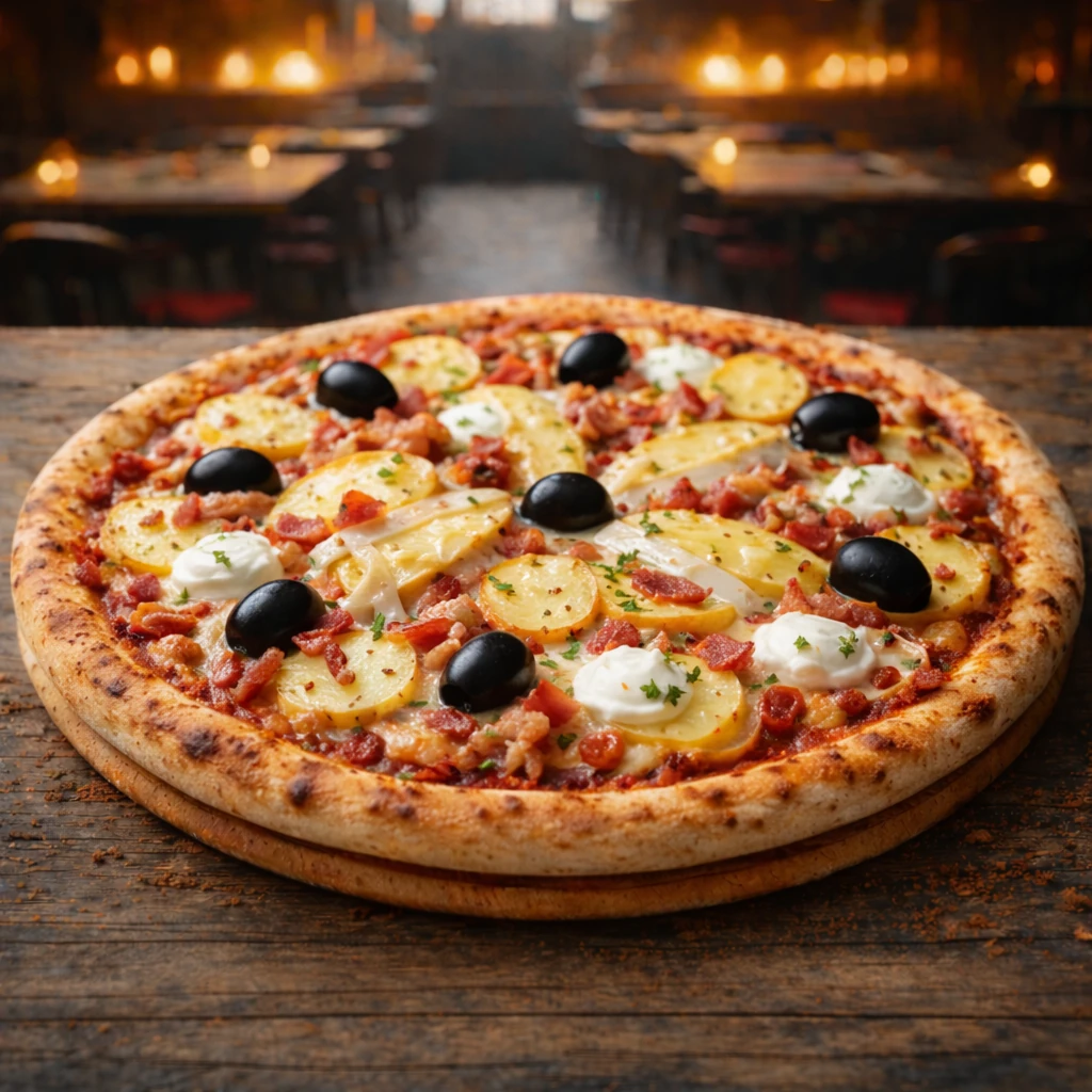 Sauce tomate, mozzarella, pommes de terre, lardons, reblochon, crème fraîche, olives